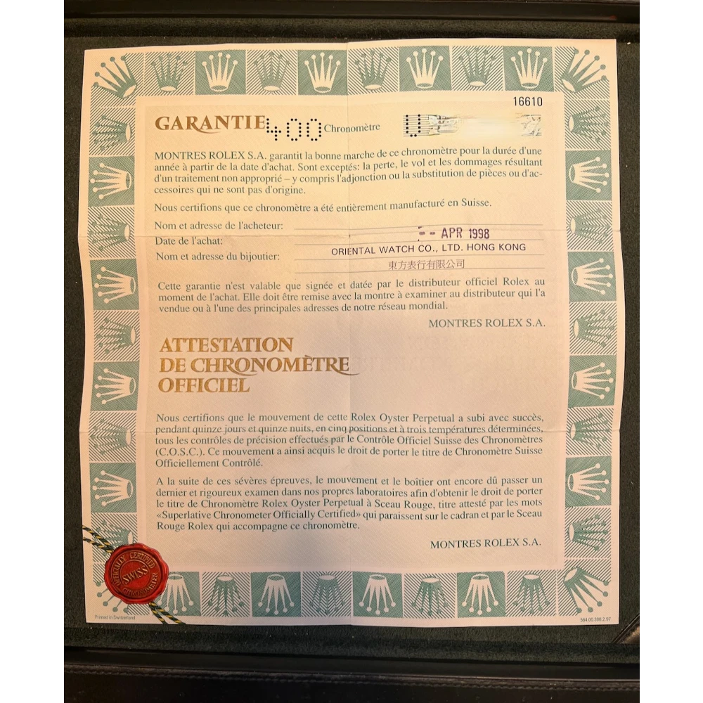 Completo di scatola, libretti, tag e Garanzia Card originali Rolex